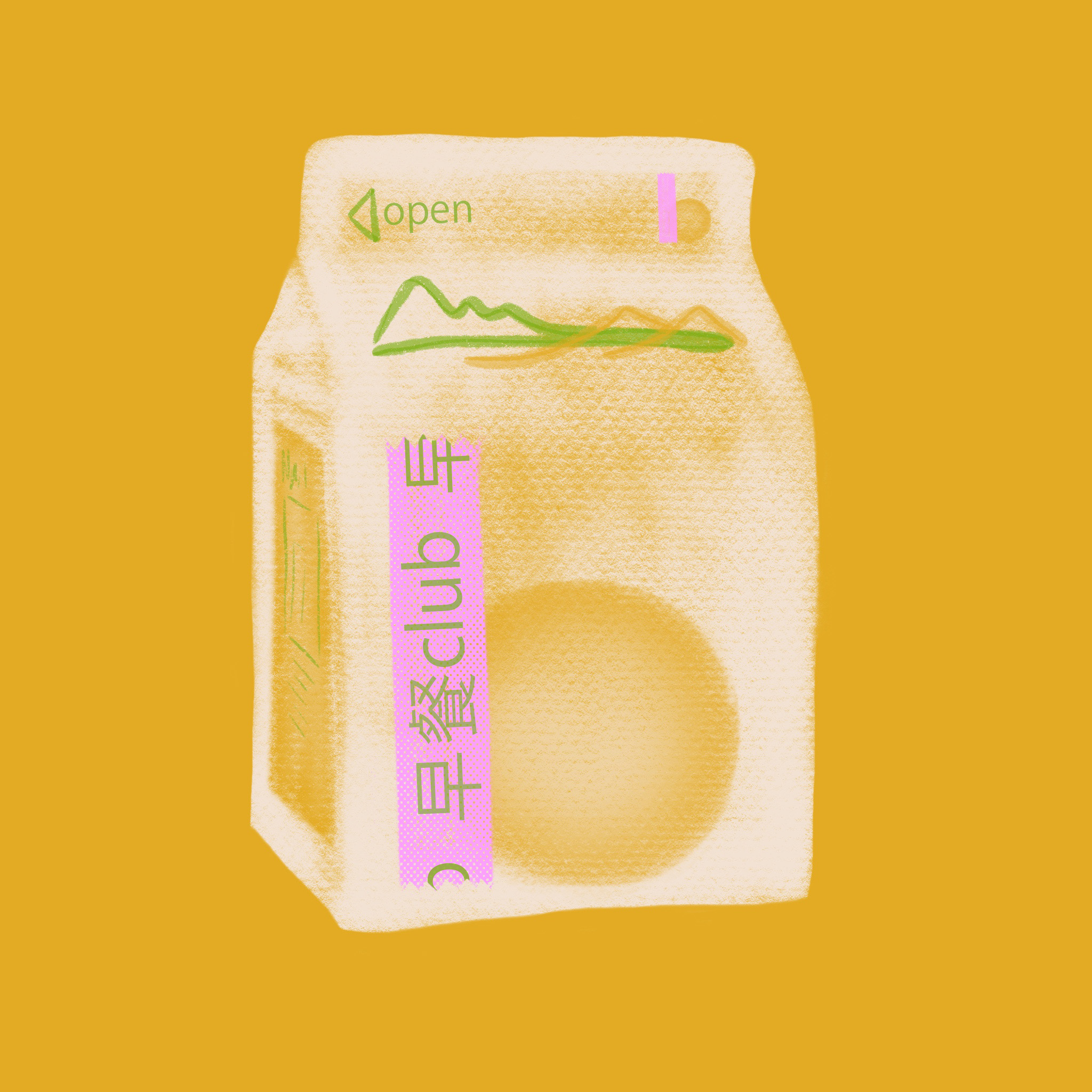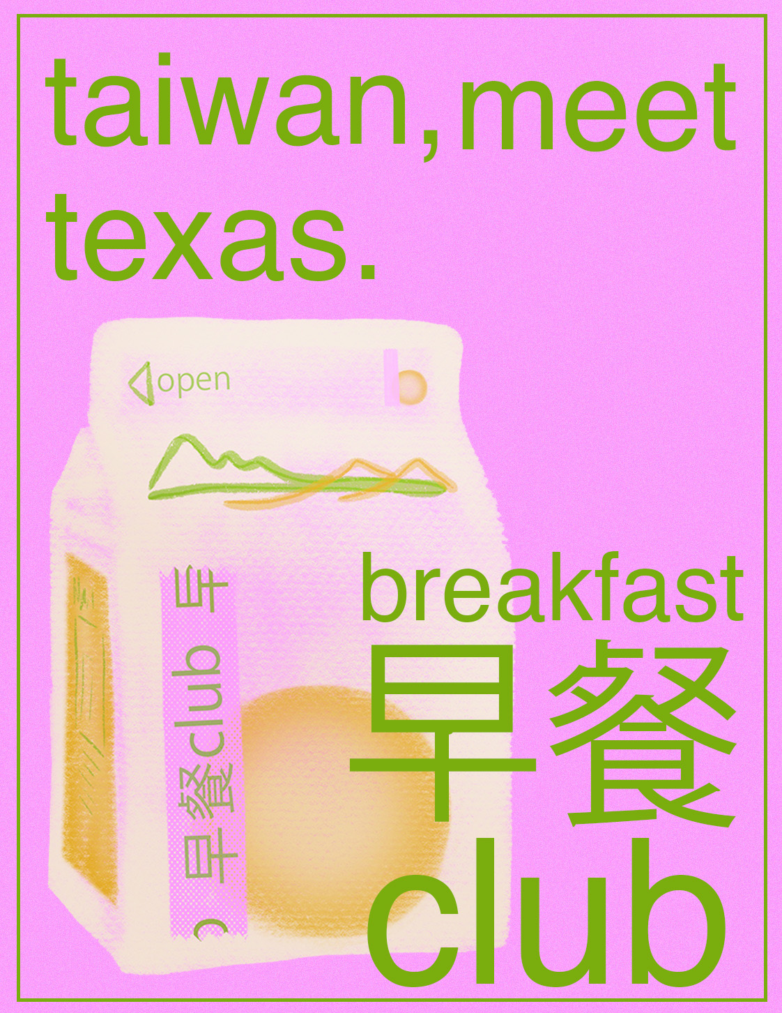 The Breakfast Club milk carton has a “b” on it, where the circle is a rising sun and the straight line is a piece of colored plastic tape oftentimes found on to-go breakfast orders in Taiwan. On the top plane of the carton, lines representing the rolling mountains of Alishan intersect with the rock mounds of countryside Texas.